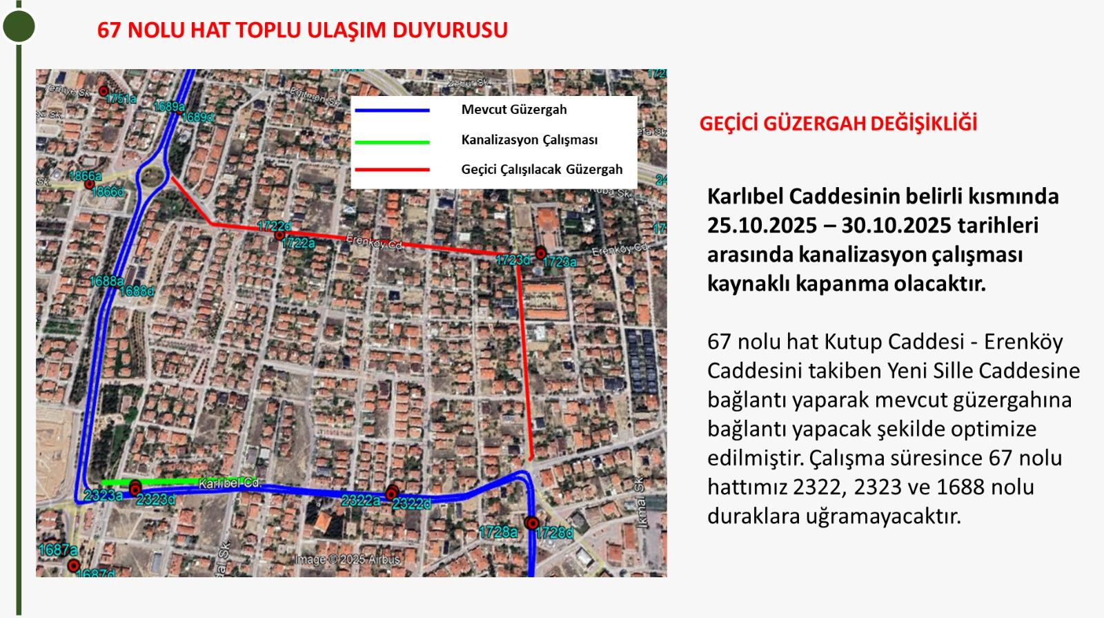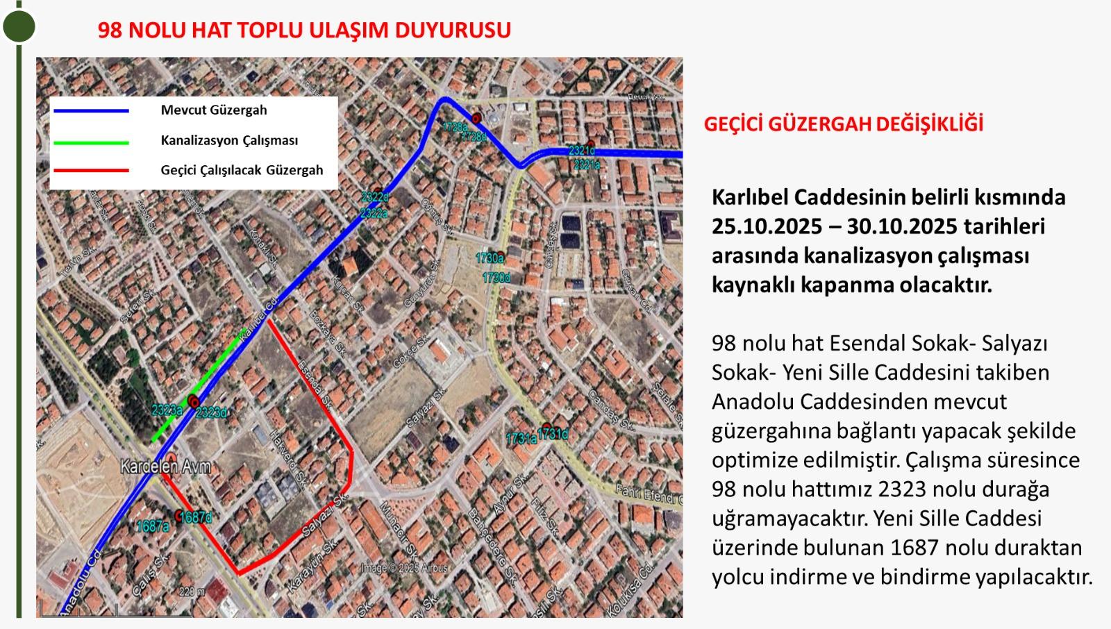 28 Ekim ve 29 Ekim 2025 tarihlerinde Ferit Paşa Caddesinde yapılacak Cumhuriyet Bayramı prova, çelenk sunma ve bayram kutlama töreni süresince 6, 7, 8, 9, 11, 12, 13, 38, 75, 76, 84, 94, 127 ve 128 nolu hatlar Eski Meram Caddesi- Larende Caddesi güzergâhından seferlerine devam edecektir. 1, 2, 4, 10, 25, 56, 67, 70, 74 ve 110 nolu hatlar ise Vatan Caddesi- Sultanşah Caddesi- Alaaddin Bulvarından Kültürpark duraklarına gelecek olup; Anıt ve Zafer duraklarına uğramayacaktır.